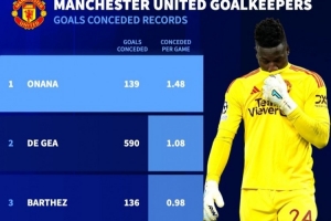 据德转统计,加上本场比赛,奥纳纳在加盟曼联后,已经被139次洞穿大门,场均丢球数达1.48个,场均丢球数高于第二位的德赫亚0.4个。