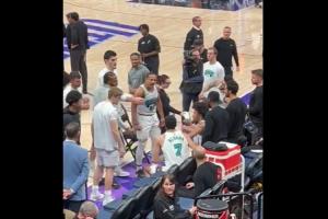 灰熊今日客场140-103大胜爵士,但比赛中有球迷拍到,替补席贝恩和阿尔达马似乎发生了冲突。