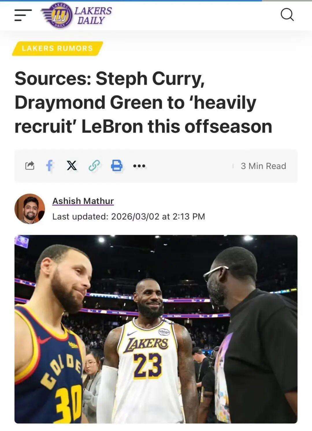撰文称库里追梦夏天将全力招募詹姆斯